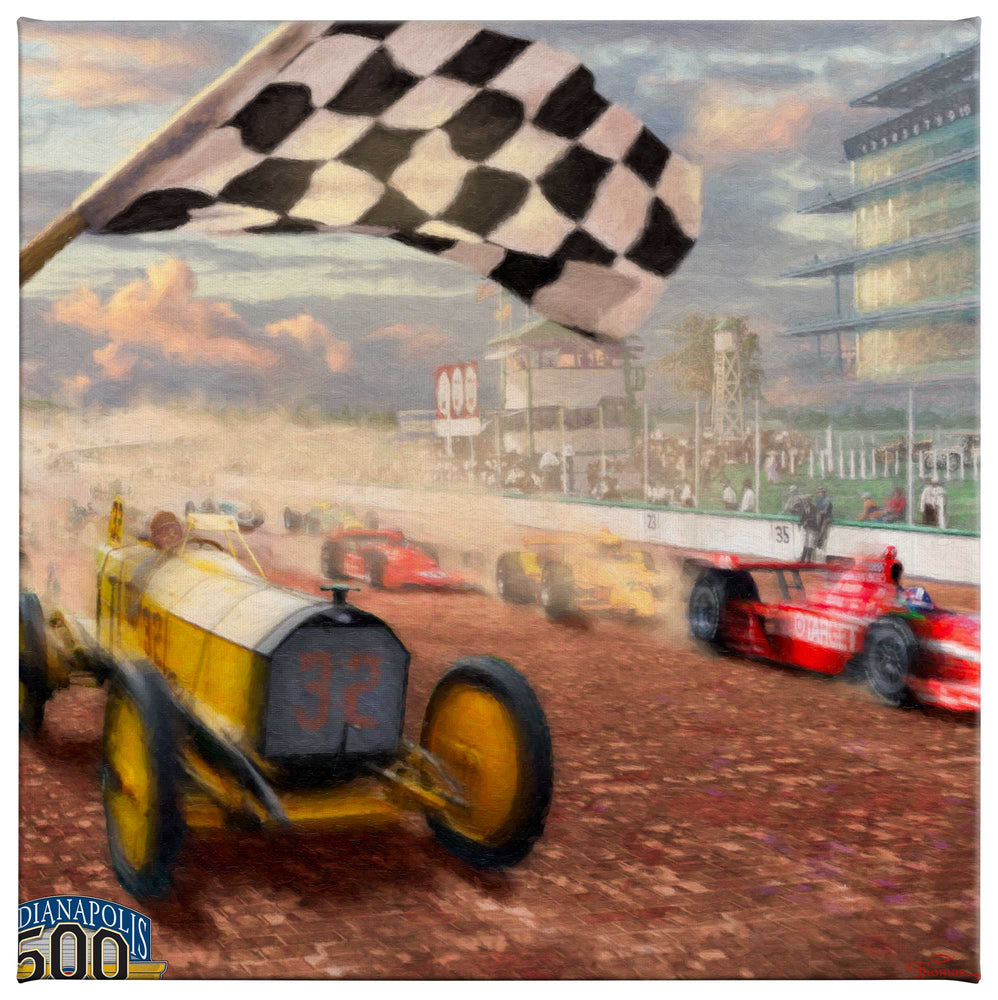 As I painted my tribute to this amazing race, I was moved by the imprint of time on this event. I wondered at the thrill of viewing the race at track level where each of these amazing warriors would engage in the challenge of winning this epic race. I paid tribute to a century of competitors with yesteryears car racing against today's elegant machines. Along the track, the smoke and dust reminiscent of 100 years of racing billows as cars round the oval towards the renowned-checkered flag. Adjacent to the track, fans spanning generations and attired in appropriate garb, gather collectively willing their champions to victory all the while feeling the sonic impact of each lap and wincing at the roar of passing cars. In the horizon, sunlight gently adorns the clouds as sun approvingly sets on this year's coronation of Indy's latest champion...what a legacy is this greatest of races. Kudos, Indy for 100 years of thrills slowly and annually acquiescing to the storied checkered flag!