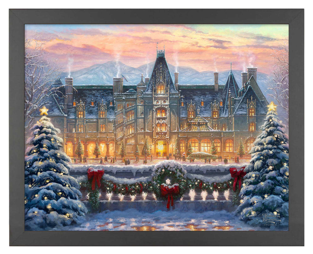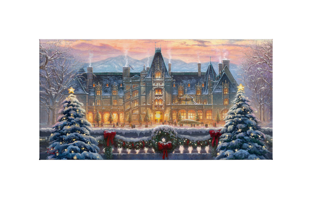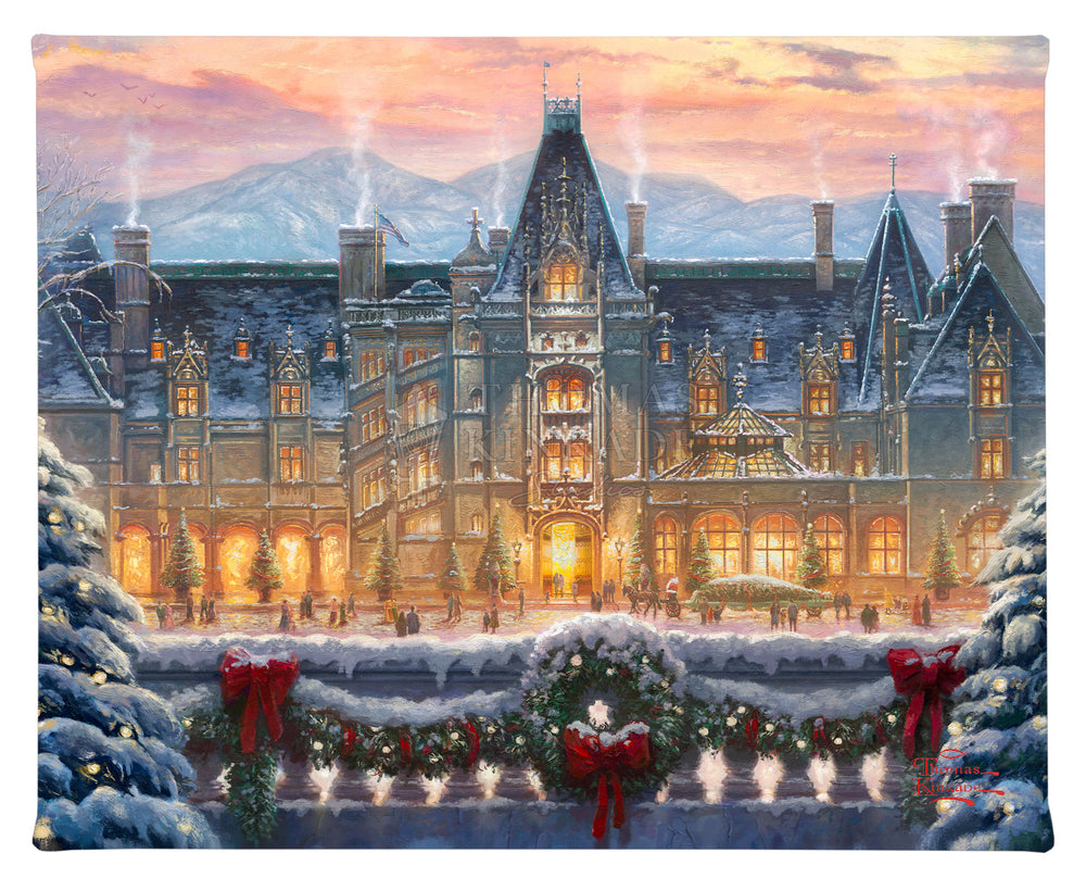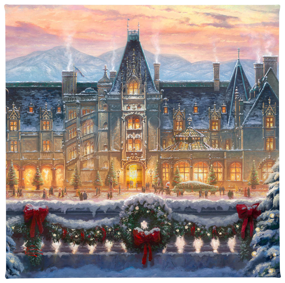 The Christmas season is the most magical time of the year. Of all the places to enjoy the Yule-tide spirit, there is none quite as wonderful as Biltmore. To visit the majestic chateau built by George Vanderbilt in 1895 is a profoundly inspiring experience. From the renowned architecture to the awe-inspiring gardens and vistas of the Blue Ridge Mountains, there is no part of this national treasure that does not touch the guest’s heart.Inside and out, from every angle and in every room, the house is made festive in a style and manner that dates back over a hundred years. Santa leads the procession as a horse drawn carriage approaches the house, bringing along a tall Frasier Fir destined to be festooned and decorated in the mansion’s Banquet Hall. Estate pastry chefs keep the annual tradition of creating a grand scale gingerbread house of Biltmore covered in sweet treats down to the smallest detail. Smells of freshly cut garland and pine wreaths mingle in the air with the scents of warmly burning hearths and the hundreds of poinsettias highlighting the lavish decor. In each room, the light of the season drawn from candles and the sparkle of ornaments dance in the shadows and in the eyes of welcomed guests. .Let this masterwork, Christmas at Biltmore®, excite your own memories of the holiday season both at the estate and from your own home and family holiday traditions. From everyone at the Thomas Kinkade Studios, we thank you for sharing the light and wish you a very merry Christmas.