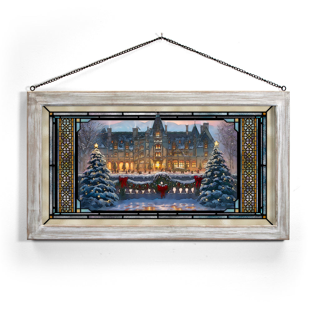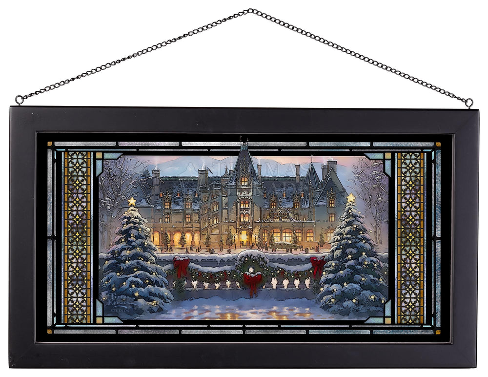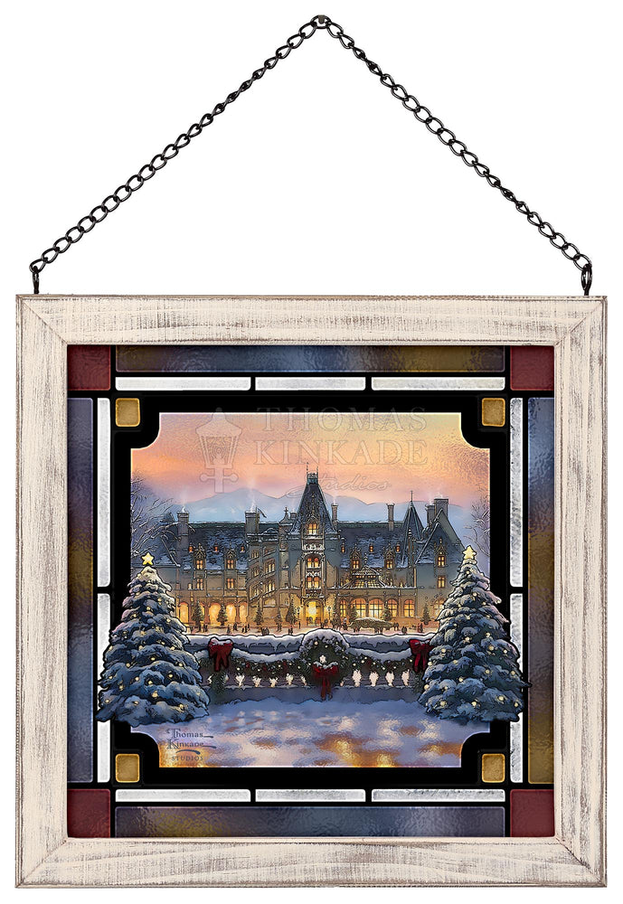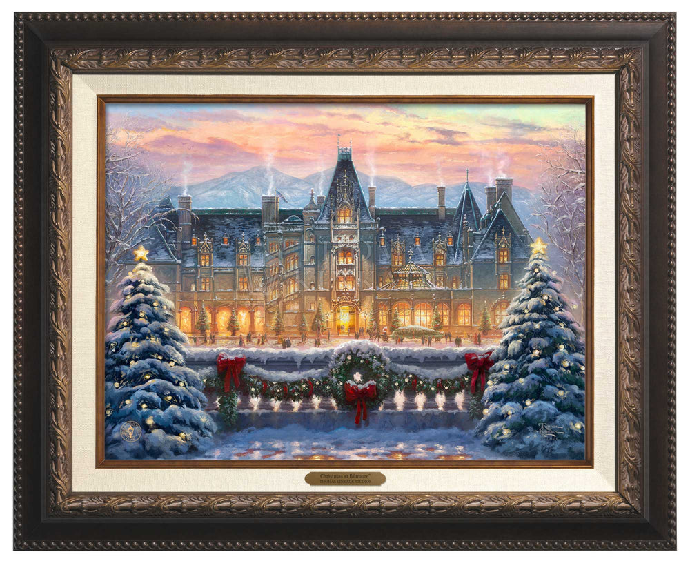 The Christmas season is the most magical time of the year. Of all the places to enjoy the Yule-tide spirit, there is none quite as wonderful as Biltmore. To visit the majestic chateau built by George Vanderbilt in 1895 is a profoundly inspiring experience. From the renowned architecture to the awe-inspiring gardens and vistas of the Blue Ridge Mountains, there is no part of this national treasure that does not touch the guest’s heart.Inside and out, from every angle and in every room, the house is made festive in a style and manner that dates back over a hundred years. Santa leads the procession as a horse drawn carriage approaches the house, bringing along a tall Frasier Fir destined to be festooned and decorated in the mansion’s Banquet Hall. Estate pastry chefs keep the annual tradition of creating a grand scale gingerbread house of Biltmore covered in sweet treats down to the smallest detail. Smells of freshly cut garland and pine wreaths mingle in the air with the scents of warmly burning hearths and the hundreds of poinsettias highlighting the lavish decor. In each room, the light of the season drawn from candles and the sparkle of ornaments dance in the shadows and in the eyes of welcomed guests. .Let this masterwork, Christmas at Biltmore®, excite your own memories of the holiday season both at the estate and from your own home and family holiday traditions. From everyone at the Thomas Kinkade Studios, we thank you for sharing the light and wish you a very merry Christmas.