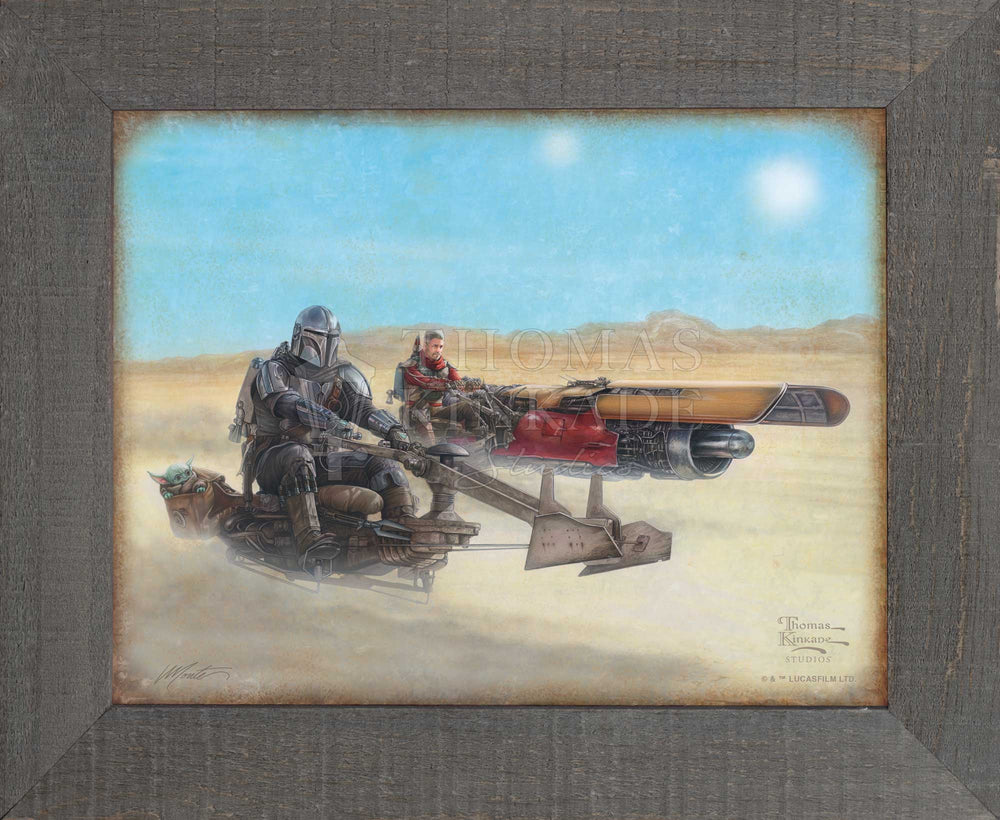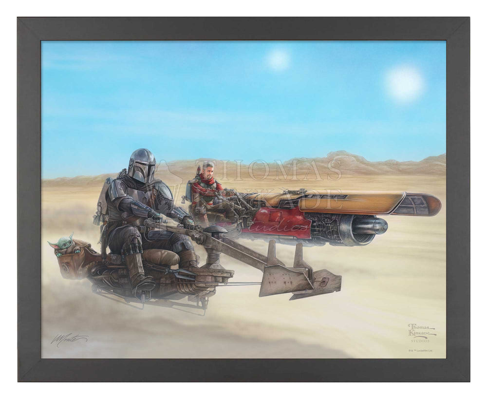 When the Mandalorian's search for others of his kind takes him to the remote desert outpost of Mos Pelgo, he finds himself teaming up with a local Marshal to rid the nearby wastelands of a fearsome krayt dragon and has the opportunity to recover priceless Mandalorian armor once owned by the fabled Boba Fett™. This episode has all the classic earmarks of a true western complete with a remote dusty town and a Marshal in need of help, nearly leading to a gunfight in a saloon. In this Thomas Kinkade Studios painting, our weary gunslingers head out on their trusty steeds across the landscape searching for their prey and some much-needed help that they will most certainly need to bring down the beast they will undoubtedly face!